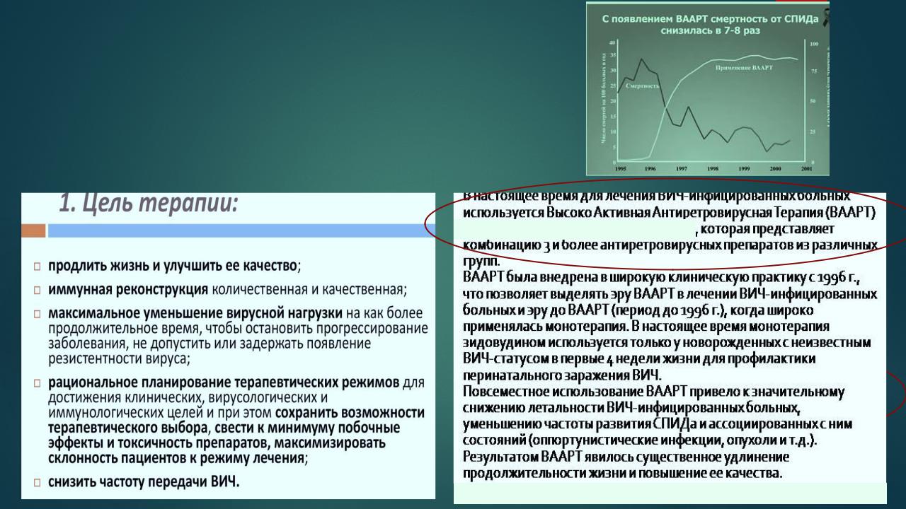 препаратом был зидовудин (одобрен в 1987 г.), терапия двумя препаратами появилась в 1996–97 годах, а терапия тремя препаратами (высокоактивная антиретровирусная терапия, ВААРТ) — в 1997–98 годах