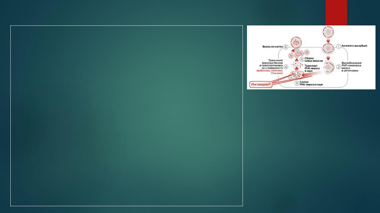 Противовирусный механизм действия связан с подавлением репродукции вируса на этапе ядерной фазы, задержкой миграции вновь синтезированного NPвируса из цитоплазмы в ядро.