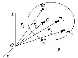 Центр масс является не материальной точкой, а геометрической. Центр масс характеризует распределение масс в системе.