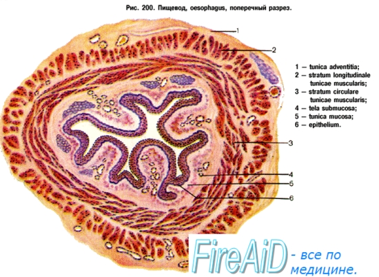 На поперечном разрезе просвет пищевода представляется в виде поперечной щели в шейной части (вследствие давления со стороны трахеи), в грудной же части просвет имеет кругловатую или звездчатую форму. Стенка пищевода состоит из следующих слоев: самый внутренний — слизистая оболочка, tunica mucosa, средний — tunica muscularis и наружный — соединительнотканного характера — tunica adventitia. Tunica mucosa содержит слизистые железы, облегчающие своим секретом скольжение пищи при глотании. Кроме слизистых желез, встречаются еще в нижнем и, реже, в верхнем отделе пищевода маленькие железки, сходные по своему строению с кардиаль-ными железами желудка. При нерастянутом состоянии слизистая собирается в продольные складки. Продольная складчатость есть функциональное приспособление пищевода, способствующее продвижению жидкостей вдоль пищевода по желобкам между складками и растяжению пищевода при прохождении плотных комков пищи. Этому содействует рыхлая tela submucosa, благодаря которой слизистая оболочка приобретает большую подвижность, а ее складки легко то возникают, то сглаживаются. В образовании этих складок участвует и слой неисчерченных волокон самой слизистой оболочки, lamina muscularis mucosae. В подслизистой основе есть лимфатические фолликулы.