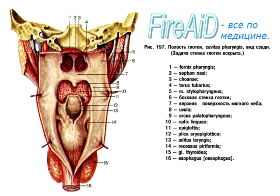Pharynx, глотка, представляет ту часть пищеварительной трубки и дыхательных путей, которая является соединительным звеном между полостью носа и рта, с одной стороны, и пищеводом и гортанью — с другой. Она протягивается от основания черепа до VI—VII шейных позвонков. Внутреннее пространство глотки составляет полость глотки, cavitas pharyngis. Глотка расположена позади носовой и ротовой полостей и гортани, впереди от базилярной части затылочной кости и верхних шейных позвонков. Соответственно органам, расположенным кпереди от глотки, она может быть разделена на три части: pars nasalis, pars oralis и pars laryngea. Верхняя стенка глотки, прилежащая к основанию черепа, называется сводом, fornix pharyngis.