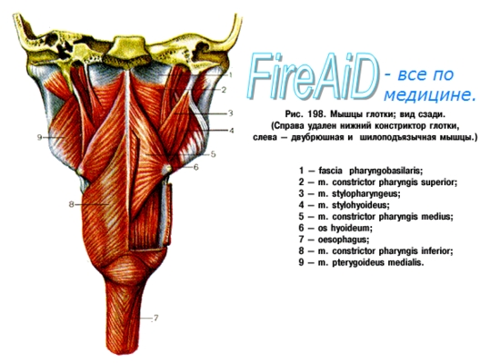 При этом чувствительная иннервация проводится и по п. glossopharyngeus и по п. vagus; мышцы глотки иннервируются п. vagus, за исключением m. stylopharyngeus, которую снабжает п. glossopharyngeus.