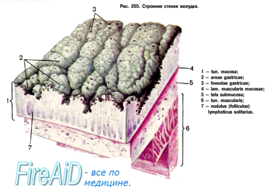 Стенка желудка состоит из трех оболочек: 1) tunica mucosa — слизистая оболочка с сильно развитой подслизистой основой, tela submucosa ; 2) tunica muscularis — мышечная оболочка; 3) tunica serosa — серозная оболочка.