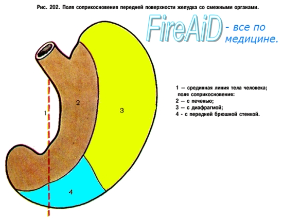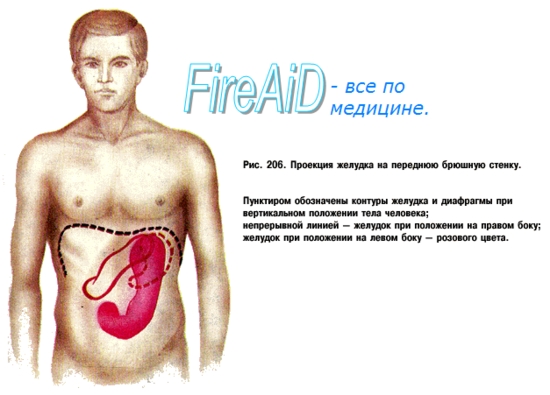 Желудок располагается в epigastrium; большая часть желудка (около 5/6) находится влево от срединной плоскости; большая кривизна желудка при его наполнении проецируется в regio umbilicalis. Своей длинной осью желудок направлен сверху вниз, слева направо и сзади наперед; при этом ostium cardiacum располагается слева от позвоночника позади хряща VII левого ребра, на расстоянии 2,5 — 3 см от края грудины; его проекция сзади соответствует XI грудному позвонку; оно значительно удалено от передней стенки живота. Свод желудка достигает нижнего края V ребра по lin. mamillaris sin. Привратник при пустом желудке лежит по средней линии или несколько вправо от нее против VIII правого реберного хряща, что соответствует уровню XII грудного или I поясничного позвонка. При наполненном состоянии желудок вверху соприкасается с нижней поверхностью левой доли печени и левым куполом диафрагмы, сзади — с верхним полюсом левой почки и надпочечником, с селезенкой, с передней поверхностью поджелудочной железы, далее внизу — с mesocolon и colon transversum, спереди — с брюшной стенкой между печенью справа и ребрами слева. Когда желудок пуст, он вследствие сокращения своих стенок уходит в глубину и освобождающееся пространство занимает поперечная ободочная кишка, так что она может лежать впереди желудка непосредственно под диафрагмой. Величина желудка сильно варьирует как индивидуально, так и в зависимости от его наполнения. При средней степени растяжения его длина около 21 — 25 см. Емкость желудка в значительной степени зависит от диетических привычек субъекта и может колебаться от одного до нескольких литров. Размеры желудка новорожденного очень невелики (длина равна 5 см).