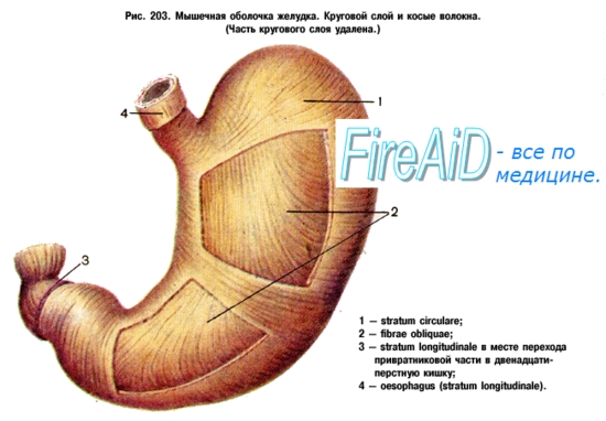 Tunica muscularis представлена миоцитами, неисчерченной мышечной тканью, которые способствуют перемешиванию и продвижению пищи; соответственно форме желудка в виде мешка они располагаются не в два слоя, как в пищеводной трубке, а в три: наружный — продольный, stratum longitudindle; средний — циркулярный, stratum circulare, и внутренний — косой, fibrae obliquae. Продольные волокна являются продолжением таких же волокон пищевода. Stratum circularе выражен сильнее продольного; он является продолжением циркулярных волокон пищевода. По направлению к выходу желудка циркулярный слой утолщается и на границе между pylorus и двенадцатиперстной кишкой образует кольцо мышечной ткани, т. sphincter pylori — сжиматель привратника. Соответствующая сфинктеру привратниковая заслонка, valvula pylorica, при сокращении сжимателя привратника совершенно отделяет полость желудка от полости двенадцатиперстной кишки. Sphincter pylori и valvula pylorica составляют специальное приспособление, регулирующее переход пищи из желудка в кишку и препятствующее обратному ее затеканию, что влекло бы за собой нейтрализацию кислой среды желудка.