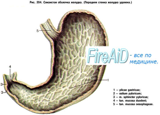 Tunica mucosa построена соответственно основной функции желудка — химической обработке пищи в условиях кислой среды. В связи с этим в слизистой имеются специальные желудочные железы, вырабатывающие желудочный сок, succus gastricus, содержащий соляную кислоту. Различают три вида желез: 1) кардиальные железы, gldndulae cardidcae; 2) желудочные железы, glandulae gastricae (propriae); они многочисленны (приблизительно 100 на 1 мм2 поверхности), расположены в области свода и тела желудка и содержат двоякого рода клетки: главные (выделяют пепсиноген) и обкладочные (выделяют соляную кислоту) ;3) пилорические железы, glandulae pyloricae, состоят только из главных клеток. Местами в слизистой разбросаны одиночные лимфатические фолликулы, folliculi lymphatici gastrici. Тесное соприкосновение пищи со слизистой оболочкой и лучшее пропитывание ее желудочным соком достигается благодаря способности слизистой собираться в складки, plicae gastricae, что обеспечивается сокращением собственной мускулатуры слизистой (lamina muscularis mucosae) и наличием рыхлой подслизистой основы, tela submucosa, содержащей сосуды и нервы и позволяющей слизистой оболочке сглаживаться и собираться в складки различного направления. Вдоль малой кривизны складки имеют продольное направление и образуют «желудочную дорожку», которая при сокращении мышц желудка может стать в данный момент каналом, по которому жидкие части пищи (вода, солевые растворы) могут проходить из пищевода в привратник, минуя кардиальную часть желудка. Кроме складок, слизистая имеет кругловатые возвышения (диаметром 1 — 6 мм), называемые желудочными полями, dreae gastricae, на поверхности которых видны многочисленные маленькие (0,2 мм в диаметре) отверстия желудочных ямок, foveolae gastricae. В эти ямки и открываются железы желудка. В свежем состоянии tunica mucosa красновато-серого цвета, причем на месте входа пищевода макроскопически заметна резкая граница между плоским эпителием пищевода (эпителием кожного типа) и цилиндрическим эпителием желудка (эпителием кишечного типа). В области отверстия привратника, ostium pyloricum, располагается циркулярная складка слизистой оболочки, отграничивающая кислую среду желудка от щелочной среды кишечника; она называется valvula pylorica.