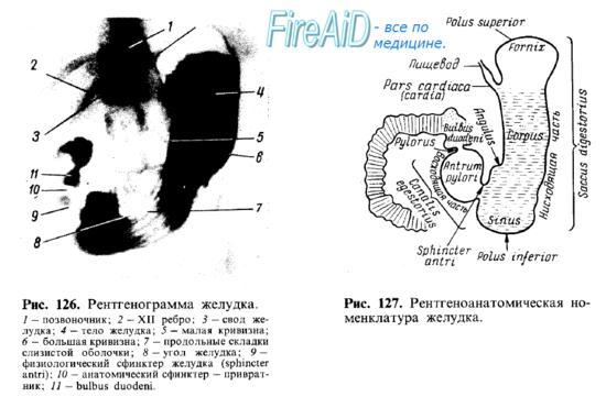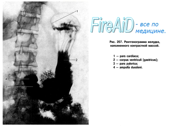 Желудок не задерживает рентгеновские лучи и поэтому не дает тени на рентгеновском снимке. Видно только просветление, соответствующее газовому пузырю: заглоченный с пищей воздух и образующиеся в желудке газы поднимаются к своду желудка. Для того чтобы сделать желудок доступным исследованию, применяют контрастирование при помощи взвеси сульфата бария.