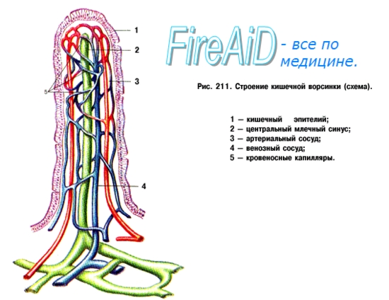Слизистая оболочка, tunica mucosa, тонкой кишки имеет матовый бархатистый вид от покрывающих ее многочисленных кишечных ворсинок, villi intestinales. Ворсинки представляют собой отростки слизистой оболочки длиной около 1 мм, покрыты, как и последняя, цилиндрическим эпителием и в центре имеют лимфатический синус и кровеносные капилляры. Функция ворсинок — всасывание питательных веществ, подвергшихся действию желчи, поджелудочного и кишечного сока, выделяемого кишечными железами; при этом белки и углеводы всасываются по венозным сосудам и проходят контроль печени, а жиры — по лимфатическим. Число ворсинок больше всего в тощей кишке, где они тоньше и длиннее. Кроме пищеварения в полости кишки, существует пристеночное пищеварение. Оно совершается в микроворсинках, видимых только под электронным микроскопом и содержащих пищеварительные ферменты.