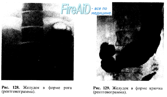 Таким образом, между формой и положением желудка отмечается корреляция: желудок в форме рога имеет чаще поперечное положение, желудок в форме крючка — косое, удлиненный желудок — вертикальное положение.