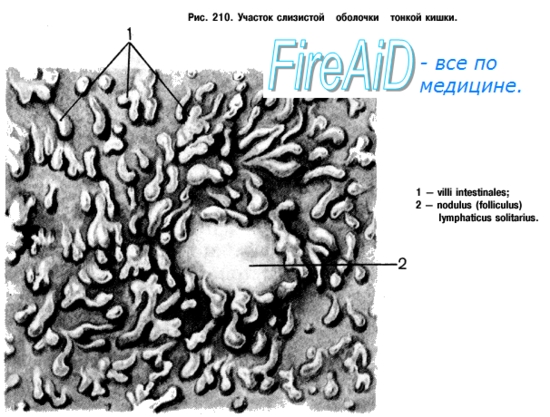 Folliculi lymphatici solitarii разбросаны по всей тонкой кишке в виде беловатых возвышений величиной с просяное зерно. Folliculi lymphatici aggregati имеются только в ileum. Они имеют вид плоских продолговатых бляшек, продольный диаметр которых совпадает с продольной осью кишки. Они располагаются на стороне, противоположной месту прикрепления к кишке брыжейки. Общее количество групповых лимфатических фолликулов 20 — 30. В лимфатическом аппарате тонкой кишки осуществляется также биологическое (внутриклеточное) переваривание пищи.