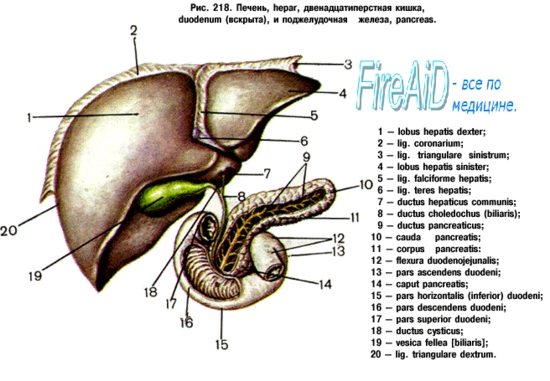 На своем пути двенадцатиперстная кишка внутренней стороной своего изгиба срастается с головкой поджелудочной железы; кроме того, pars superior соприкасается с квадратной долей печени, pars descendens — с правой почкой, pars horizontalis проходит между а. и v. mesentericae seperiores спереди и aorta и v. cava inferior — сзади. Duodenum брыжейки не имеет и покрыта брюшиной лишь частично, главным образом спереди. Отношение к брюшине ближайшего к pylorus участка (на протяжении около 2,5 см) такое же, как и выходной части желудка. Передняя поверхность pars descendens остается не прикрытой брюшиной в ее среднем участке, где pars aescendens пересекается спереди корнем Ьрыжеики поперечной ободочной кишки; pars horizontalis покрыта брюшиной спереди, за исключением небольшого участка, где двенадцатиперстную кишку пересекает корень брыжейки тонкой кишки, заключающий vasa mesenterica superiores. Таким образом, duodenum можно отнести к экстраперитонеальным органам.