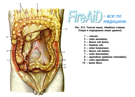 Intestinum crassum, толстая кишка, простираясь от конца тонкой кишки до заднепроходного отверстия, разделяется на следующие части: 1) caecum — слепая кишка с червеобразным отростком, appendix vermiformis; 2) colon ascendens — восходящая ободочная кишка; 3) colon transversum — поперечная ободочная кишка; 4) colon descendens — нисходящая ободочная кишка; 5) colon sigmoideum — сигмовидная ободочная кишка; 6) rectum — прямая кишка и 7) canalis analis — заднепроходный (анальный) канал.
