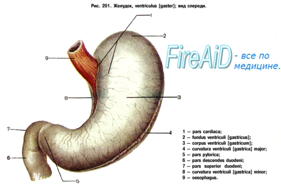 Артерии желудка происходят из truncus coeliacus и a. lienalis. По малой кривизне располагается анастомоз между a. gastrica sinistra (из truncus coeliacus) и a. gastrica dextra (из a. hepatica communis), по большой — аа. gastroepiploica sinistra (из a. lienalis) et gastroepiploica dextra (из a. gastroduodenalis). К fornix желудка подходят аа. gastricae breves из a. lienalis. Артериальные дуги, окружающие желудок, являются функциональным приспособлением, необходимым для желудка как для органа, меняющего свои форму и размеры: когда желудок сокращается, артерии извиваются, когда он растягивается, артерии выпрямляются. Вены, соответствующие по ходу артериям, впадают в v. portae. Отводящие лимфатические сосуды идут от разных частей желудка в разных направлениях.