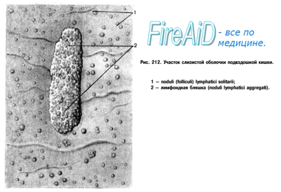 Слизистая оболочка толстой кишки в связи с ослаблением процесса всасывания (всасывается главным образом вода) не имеет ворсинок, и поэтому она в отличие от слизистой оболочки тонкой кишки гладкая. Круговые складки, которые имеются в тонкой кишке, в толстой разбиваются на отдельные отрезки и становятся полулунными, plicae semi-lunares coli, состоящими не только из слизистой, но и из остальных слоев стенки. В функционирующей кишке возникают продольные и косые складки. В слизистой оболочке содержатся только кишечные железы и одиночные фолликулы. Мышечная оболоч-к а состоит из двух слоев: наружного — продольного и внутреннего — циркулярного. Сплошным является только внутренний циркулярный, суживающий, который утолщается в связи с необходимостью проталкивать плотные каловые массы. Наоборот, расширяющая продольная мускулатура (сплошная в тонкой кишке) в толстой распадается на описанные выше три teniae, так как расширение просвета облегчается давлением самих каловых масс.