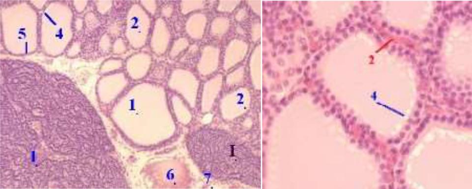 •парафолликулярные клетки (2) - не поглощают йод (светлые).