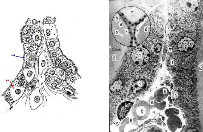 •1. В стенке фолликулов - клетки двух видов: тироциты (фолликулярные) (1) - поглощают йод,