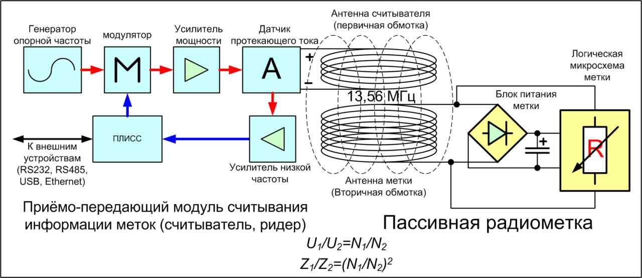 Принцип работы меток предельно прост и описывается как работа обычного трансформатора. Все мы знаем что трансформатор – это элемент позволяющий изменять величину протекающего по нему тока и поданного на его первичную обмотку напряжения в соотношении количества витков его первичной и вторичной обмотки U1/U2=N1/N2. А вот импеданс обмоток меняется уже в совершенно другой пропорции: Z1/Z2=(N1/N2)^2. Соответственно небольшое изменение импеданса в нагрузке будет явно заметно для опрашивающего устройства. Соответственно получаем следующую систему: приёмо-передающий модуль, в качестве антенны у которого некая обмотка (первичная). Метка – это чип, с вторичной обмоткой соответственно. При поднесении считывателя к метке, через обмотку метки начинает течь ток и от него запитывается чип, который, изменяя импеданс в нагрузке обмотки, передаёт информацию считывателю.