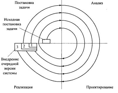 годов была предложена спиральная модель ЖЦ (рис.4). Ее особенность: прикладное ПО создается не сразу, как в случае каскадного подхода, а по частям с использованием метода прототипирования.