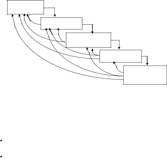 Модель с промежуточным контролем. Схема, поддерживающая итерационный характер процесса разработки, была названа схемой с промежуточным контролем (рис. 3). Контроль, который выполняется по данной схеме после завершения каждого этапа, позволяет при необходимости вернуться на любой уровень и внести необходимые изменения. Межстадийные корректировки обеспечивают большую надежность, хотя увеличивают весь период разработки.