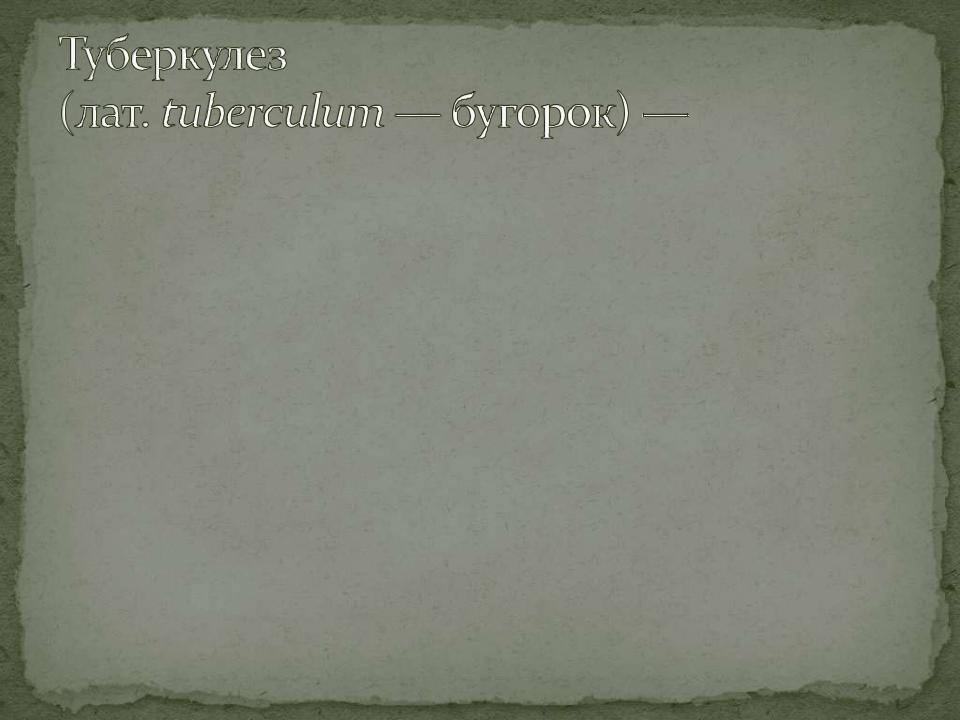 инфекционное заболевание человека и животных с наклонностью к хроническому течению, характеризующееся образованием специфических воспалительных измене-ний, часто имеющих вид маленьких бугорков, с преимущественной локали-зацией в лёгких и лимфатических узлах.