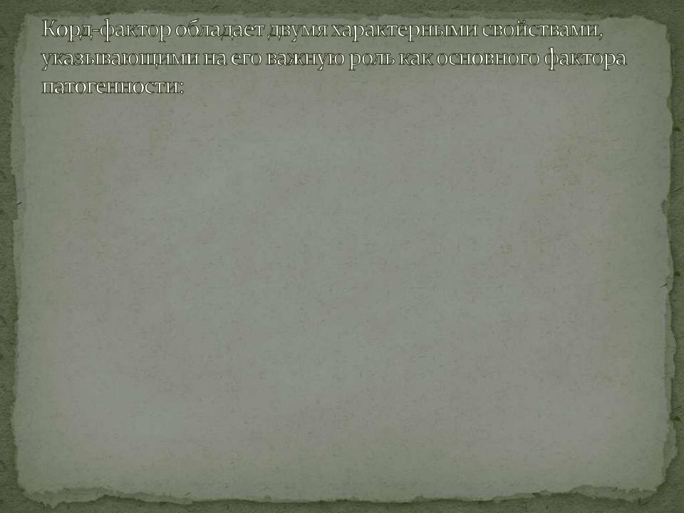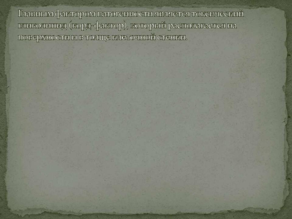 (С186Н366О111). Корд-фактор не только оказывает токсическое действие на ткани, но и защищает туберкулезные палочки от фагоцитоза, блокируя окислительное фосфорили-рование в митохондриях макрофагов. Будучи поглощенными фагоцитами, они размножаются в них и вызывают их гибель.