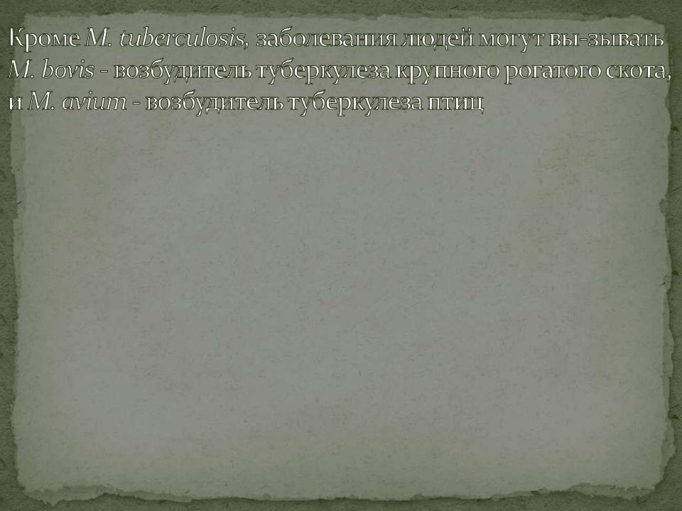М. bovis — короткие и умеренно длинные толстые палочки. М avium отличаются большим полиморфизмом (короткие и длинные палочки, иногда нити), оптимальная температура для их роста