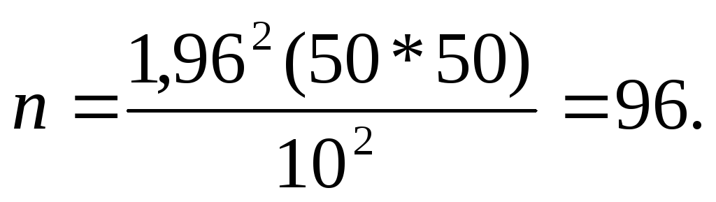 Принимая вариацию, равную 50%, точность, равную ±10%, при 95%-ном уровне доверительности, рассчитаем размер выборки: