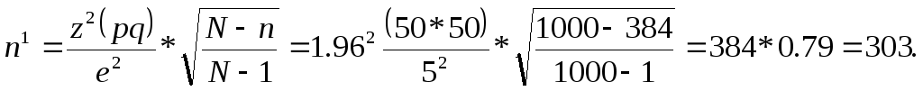Например, изучается мнение членов совокупности, состоящей из 1000 компаний, относительно изменения местной налоговой политики органами власти определенного региона. Вследствие отсутствия информации о вариации принимается наихудший случай 50:50. Решено использовать уровень доверительности, равный 95%. Заказчик исследования заявил, что его устроит точность результатов +5%. Тогда, используя формулу для процентной меры, получим