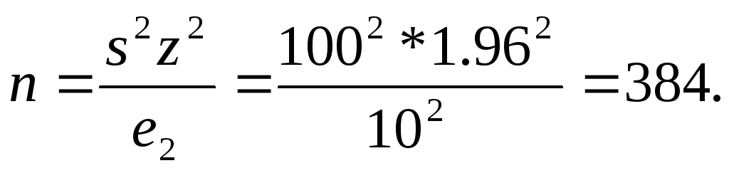 Возможно определение объема выборки на основе использования средних значений, а не процентных величин, как это делалось выше. Предположим, что выбран уровень доверительности, равный 95% (z=1,96), среднее квадратическое отклонение (s) рассчитано равным 100 и желаемая точность (погрешность) составляет +10. Определение объема выборки (n):