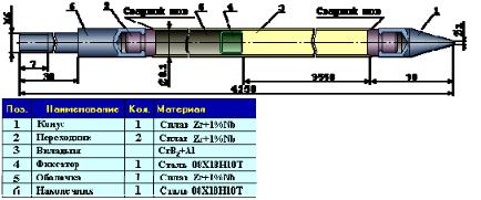 СВП представляет собой герметичную оболочку, заполненную вкладышами из поглощающего материала (CrB2 в алюминиевой матрице), зафиксированными от перемещений фиксатором. Герметизация оболочки произведена посредством сварки с переходниками. К нижнему переходнику способом завальцовки присоединен конус для облегчения ввода СВП в канал кассеты, а к верхнему – наконечник для его крепления к головке пучка.