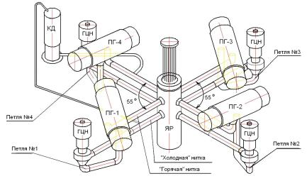 Угол между парными петлями 55°. Каждая из четырех циркуляционных петель имеет “горячую” и “холодную” нитки. Участки между выходными патрубками реактора и входными патрубками ГЦН называются “горячими” нитками. Участки между выходными патрубками ПГ и патрубками всаса ГЦН, между нагнетающими патрубками ГЦН и входными патрубками реактора называются “холодными” нитками. По “горячим” ниткам нагретый в реакторе теплоноситель подается к парогенераторам. По “холодным” ниткам охлажденный теплоноситель возвращается из парогенераторов в реактор. Для обеспечения циркуляции теплоносителя между реактором и парогенераторами в «холодных» нитках установлены ГЦН.