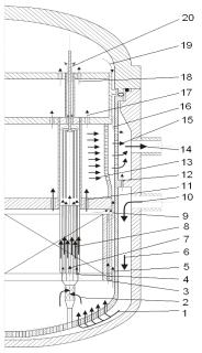 1 – в отверстия эллиптического днища шахты; 2 – вход в опорные стаканы; 3 – в каналы выгородки; 4 – в направляющие трубы каналов ПЭЛ; 5 – между выгородкой и шахтой; 6 – в опускной кольцевой зазор; 7 – в центральную трубку ТВС; 8 – охлаждение твэлов; 9 – в зазор между БЗТ и шахтой; 10 – вход в реактор; 11 – через отверстия опорной плиты БЗТ; 12 – от входных к выходным патрубкам; 13 – через перфорацию обечайки БЗТ; 14 – выход из реактора; 15 – через перфорацию шахты; 16 – выход из-под крышки; 17 – через среднюю плиту БЗТ под крышку; 18 – через верхнюю плиту БЗТ под крышку; 19 – в щели между буртом БЗТ, крышкой и шахтой; 20 – выход из защитных каркасов