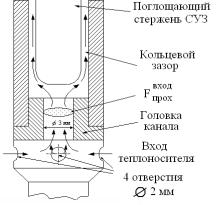 Для охлаждения органов СУЗ в нижней части направляющих каналов для поглощающих стержней имеются отверстия для прохода теплоносителя диаметром 4 мм (рис. 2.7). Раньше этих отверстий было четыре, они располагались под углом 90° друг относительно друга. Сейчас применяются ТВС с направляющими каналами, где имеется только два отверстия, расположенных на одной оси. Это объясняется тем, что при наличии четырёх