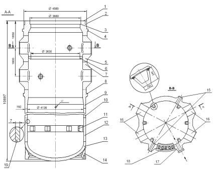 1 – фланец корпуса; 2 – наплавка; 3 – бурт для установки шахты внутрикорпусной; 4 – бурт для установки кольца упорного; 5 – верхняя обечайка зоны патрубков; 6 – кольцо разделительное; 7 – нижняя обечайка зоны патрубков; 8 – опорный бурт; 9 – опорная обечайка; 10 – обечайка цилиндрической части; 11 − кронштейн-виброгаситель; 12 – обечайка цилиндрической части; 13 – эллиптическое днище; 14 – транспортная обечайка; 15 – патрубки Ду 300; 16 – патрубки Ду 850; 17 – патрубок КИП Ду 250; 18 – резъбовые гнезда; 19 – антикоррозионная наплавка