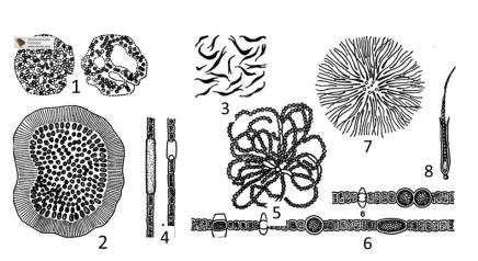 –— микроцистис;;- 4 –— осцилатория;5; —– вольвокс; 6 –— хлореллала;7; –— педиаструм;