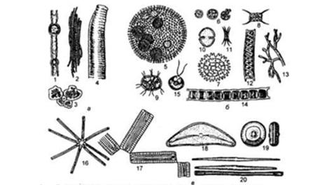спирогира;;13 –— кладоформа:;14 –— улотрикс; 15 –— хламидомонас; 16 - астерио- нела; 17 –— диатома;;18 —– сибела:; 19 —– циклотела; 20 –— синедра