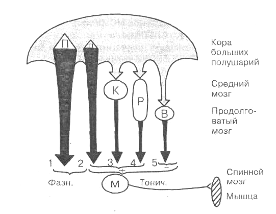 I — быстрая подсистема и 2 — медленная подсистема корково-спиномозго-вого пути (пирамидного тракта); 3 — корково-красноядерно-спшомозговой путь. Латеральная система — 1, 2, 3. Медиальная система — 4, 5. М — мотонейрон спинного мозга, получающий фазные (Фазн.) и тонические (Тонич.) возбуждающие (+) и тормозящие (—) влияния.