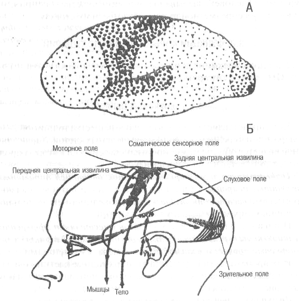 Первичные поля связаны с органами чувств и органами движения на периферии. Они обеспечивают возникновение ощущений. К ним относятся, например, поле болевой и мышечно-суставной чувствительности в задней центральной извилине коры, зрительное поле в затылочной области, слуховое поле в височной области и моторное поле в передней центральной извилине. В первичных полях находятся высокоспециализированные клетки-определители или детекторы, избирательно реагирующие только на определенные раздражения. Например, в зрительной коре имеются нейроны-детекторы, возбуждающиеся только при включении или при выключении света, чувствительные лишь к определенной его интенсивности, к конкретным интервалам светового воздействия, к определенной длине волны и т.д. При разрушении первичных полей коры возникают корковая слепота, корковая глухота и т.п. Вторичные поля расположены рядом с первичными. В них происходит осмысливание и узнавание звуковых, световых и других сигналов, возникают сложные формы обобщенного восприятия. При поражении вторичных полей сохраняется способность видеть предметы, слышать звуки, но человек их не узнает, не помнит значения.
