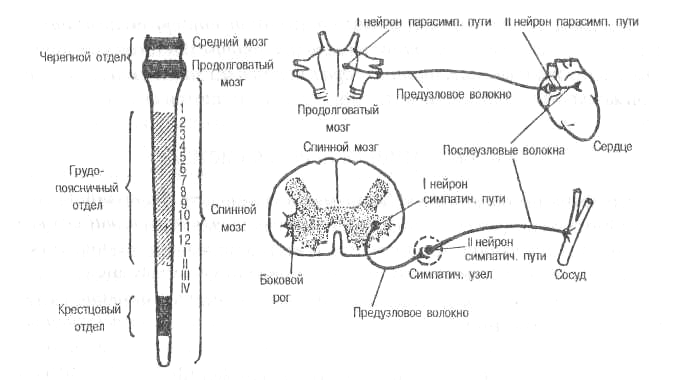 Слева — область выхода волокон: парасимпатической (черный цвет) и симпатической (заштриховано) систем. Справа — строение эфферентной части рефлекторной дуги вегетативных рефлексов. Слева — схема среднего, продолговатого и спинного мозга. Арабские цифры — номера грудных сементов, римские — номера поясничных сегментов