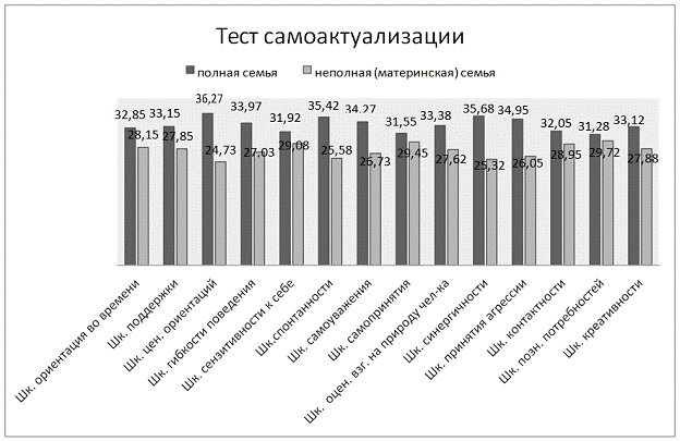 Таким образом, нами было выявлено, что по тесту «Самоактуализации» Э. Шострома средние значения по всем шкалам у юношей из полных семей выше, чем у юношей из неполных семей. Однако, только по шкалам: «Ценнностные ориентации», «Спонтанность», «Синергичность» и «Принятие агрессии» существуют значимые различия между юношами, воспитывающимися обоими родителями и юношами из материнских семей.