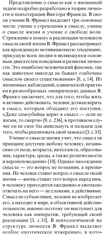 Теория личности Франкла состоит из трех частей: учение о стремлении к смыслу, учение о смысле жизни и учение о свободе воли. Стремление к поиску и реализации человеком смысла своей жизни Франкл рассматривает как врожденную мотивационную тенденцию, присущую всем людям и являющуюся основным двигателем поведения и развития личности. Этот смысл находится не в самом человеке, а во внешнем мире и не побуждает человека изнутри как имманентное влечение, а заставляет его стремиться к реализации чего-то, что находится вне его самого. Отсутствие смысла жизни или невозможность его реализовать порождает у человека состояния экзистенциального вакуума и экзистенциальной фрустрации, выступающие причиной особого рода ноогенных неврозов, связанных с апатией, депрессией и утратой интереса к жизни. Вопрос о смысле жизни не может быть абстрактным. Смысл жизни меняется от человека к человеку, изо дня в день, от часа к часу. Человек при этом находится в положении не спрашивающего, а отвечающего на этот вопрос, который ставит перед ним жизнь, и несет ответственность за то, как он ответит на этот вопрос своими реальными поступками. Помимо уникальных смыслов существуют ценности – смысловые универсалии, кристаллизирующие в себе обобщенный опыт раскрытия человечеством смысла типичных ситуаций. Ценности и смыслы выполняют одну и ту же функцию. Франкл описывает три класса ценностей, которые позволяют сделать жизнь человека осмысленной: ценности творчества, в первую очередь труд; ценности переживания, в частности любовь, и ценности отношения, сознательно принимаемого по отношению к тем критическим жизненным обстоятельствам, которые мы не в состоянии изменить. Смысл жизни можно найти в любом из этих трех обличий; из этого следует, что нет таких обстоятельств и ситуаций, в которых человеческая жизнь утратила бы свой смысл.