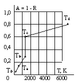 В качестве опорных точек для построения графика использованы температуры в точках а, b и d кривой R(t) на рис. 8. Точка Т0, отвечающая комнатной температуре, получена независимо, с применением стандартных методов. Приведенный график иллюстрирует принципиальную возможность, пользуясь изложенным методом измерения относительной отражательной способности металла, исследовать более детально зависимости R(T) и А(Т) в области температур вплоть до Т ~ 104 К, что представляет принципиальный интерес. Для этого необходимо лишь повысить плотность энергии светового потока, фокусируемого на поверхность металла, что не вызывает принципиальных затруднений [16].