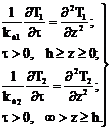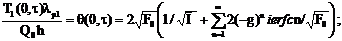 Соотношения (50) описывают идеальный тепловой контакт между слоями (равенство температур и тепловых потоков на границе контактирования). Предполагается, что временная зависимость импульса излучения имеет вид φ(τ) = 1 для τ > 0.