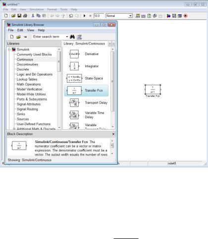 Выбрать и расположить в окне необходимые для модели блоки можно указав курсором на требуемый блок в выбранном разделе (например Continuous – Transfer Fcn) и нажав на левую клавишу “мыши” - “перетащить” блок в созданное окно (рис. 1.23).