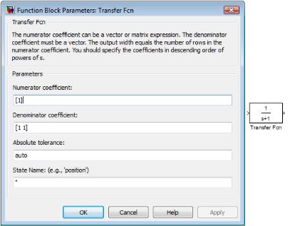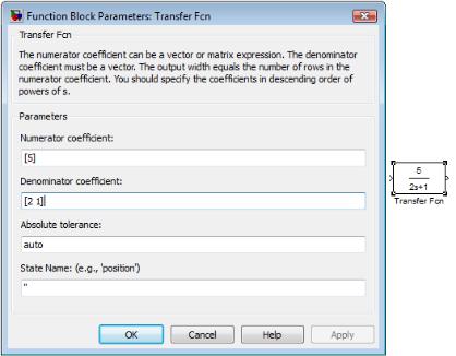 Рис. 1.25. Функциональное окно блока Transfer Fcn