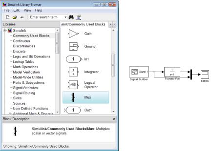 спомощью блока Mux в списке Commonly Used Blocks (рис. 1.26). Соединение двух блоков (вход - выход) осуществляется удерживанием и соединением входа с выходом левой кнопкой мыши. При подведении мыши ко входу курсор меняет форму на крест.