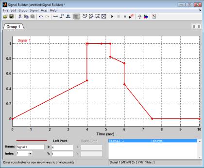 В окне построения сигналов красным цветом показан ломаный сигнал в масштабе времени. За угол излома можно ухватиться мышью и изменить его форму. Также есть возможность изменять уровень сигнала по амплитуде. Для этого необходимо щелкнуть мышью на угол сигнала, точка угла выделится красным кругом. Внизу окна (Left Point, Right Point) можно вручную изменить координаты этой точки. Если не хватает точек для построения нужного сигнала, то можно добавить необходимое количество точек, щелкнув в нужное место правой кнопкой мыши, удерживая клавишу Shift (рис. 1.28).