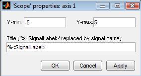 3. Щелкнуть правой клавишей “мыши” в окне графиков и, выбрать команду Axes properties… в контекстном меню. Откроется окно свойств графика, в котором с помощью параметров Y-min и Y-max можно указать предельные значения вертикальной оси. В этом же окне можно указать заголовок графика (Title), заменив выражение %<SignalLabel> в строке ввода. Окно свойств показано на рис. 1.32.
