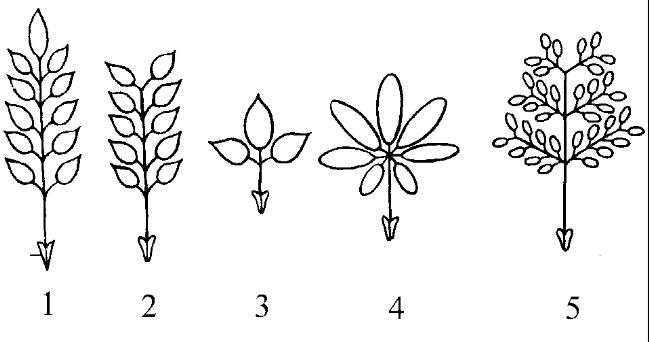 1 – непарноперистосложный; 2 – парноперистосложный; 3 – тройчатосложный; 4 – пальчатосложный; 5 – дважды парноперистосложный |