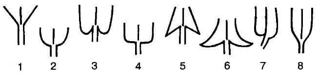 1 – клиновидная; 2 – округлая; 3 – сердцевидная; 4 – усеченная; 5 –стреловидная; 6 – копьевидная; 7 – неравнобокая; 8 – суженная |